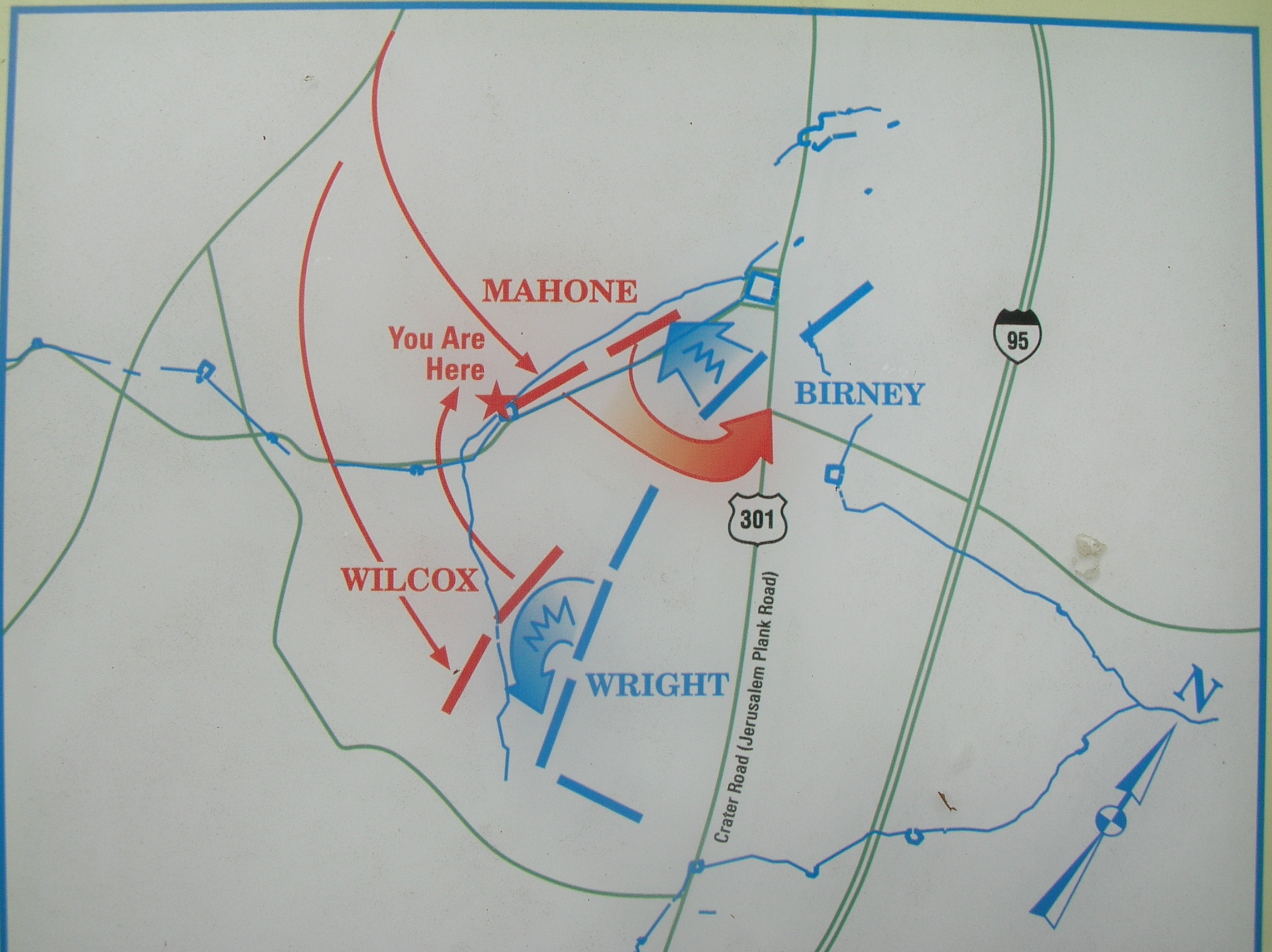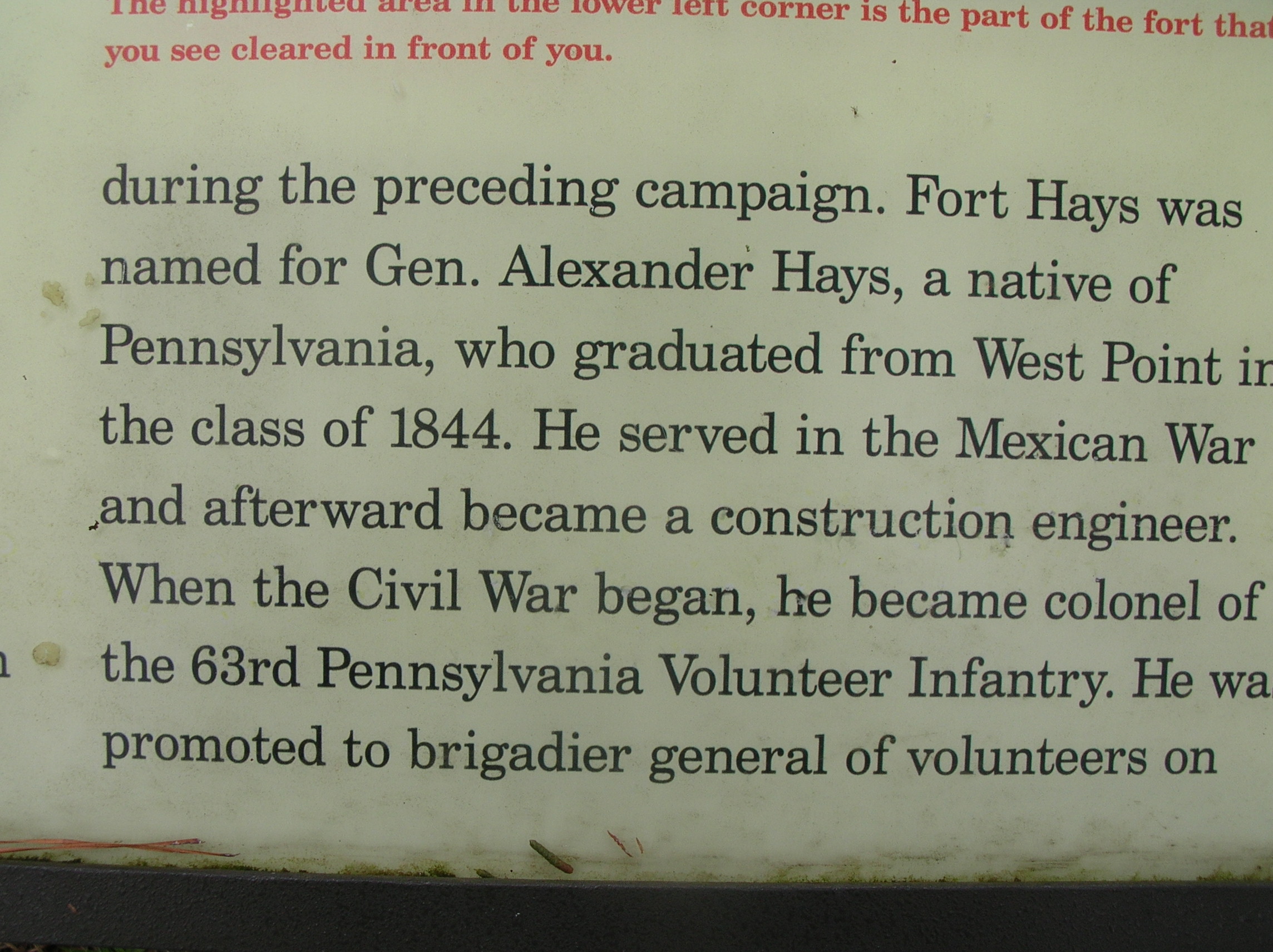 The small panel near the road shows the bunkers and magazine but not a lot of information. There is one 1885 battle shown in the area on the plaques showing a part of the attempted breakout by Lee and the thrust going past Fort Hayes on March 25, 1865. This is very likely the battle Richard describe to his sister in the letter of April 1, 1865 where he was caught behind the lines as the others retreated.