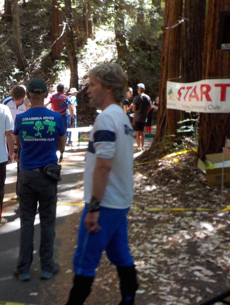 In Orienteering for any race, each competitor in an age group starts at least three minutes apart from other members of that group. This is to prevent following. Here I am among the redwoods of Big Basin (Back turned in Blue Columbia Gorge Orienteering Club shirt) waiting at the start to be called up for the beginning of the Middle Distance event.