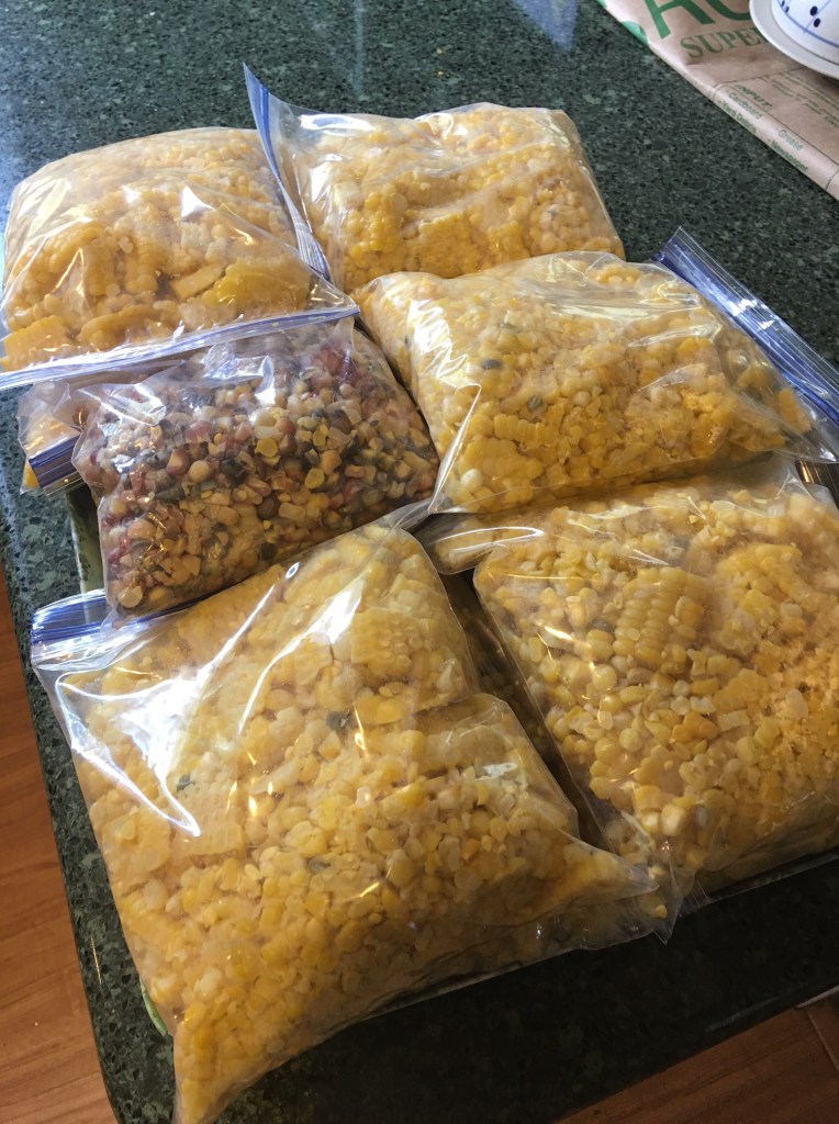 Now to throw all that corn into boiling water and cook it up for 2-3 minutes, let cool and slice off all the Kernals to go into freezer bags. Here’s some of the final take: